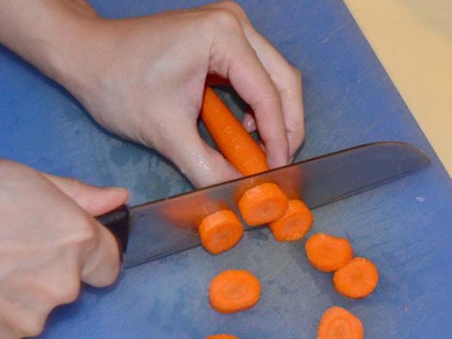 長さ4㎝ぐらいに切り、人参なら太さを4等分にカットして、角を面取りします。